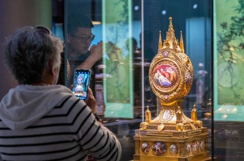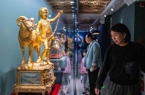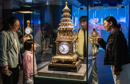 图片说明:2025年5月18日,呼和浩特博物院,观众在“钟鸣盛世:紫禁城和承德避暑山庄藏钟表联展”上参观铜镀金月球顶人打乐钟。