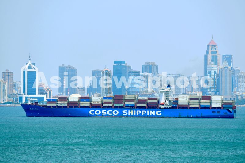 2025年5月18日,随着外贸行情好转,连接山东港口青岛港的青岛胶州湾航道,装载外贸集装箱以及其他货物的货轮来往穿梭,海运一派繁忙。