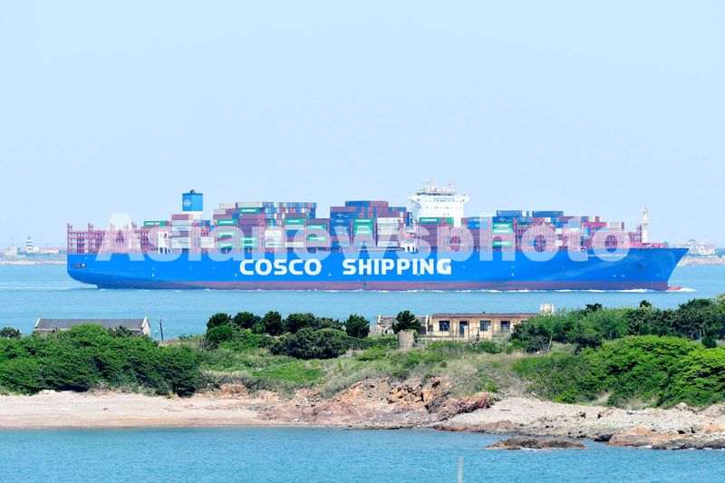 2025年5月18日,山东青岛胶州湾,装载外贸集装箱的货轮从青岛港驶出。