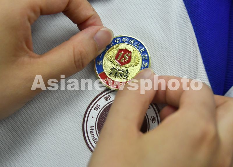 图片说明:2025年5月18日,在河北省邯郸市永年区的衡一永华中学成人礼活动上,家长正在为学生佩戴“成人礼纪念章”。