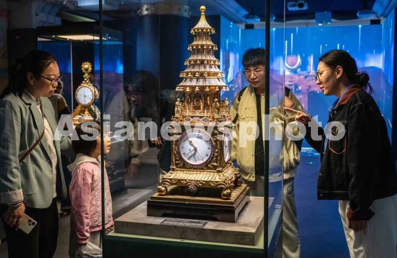 图片说明:2025年5月18日,呼和浩特博物院,观众在“钟鸣盛世:紫禁城和承德避暑山庄藏钟表联展”上参观铜镀金嵌料石转人升降塔钟。