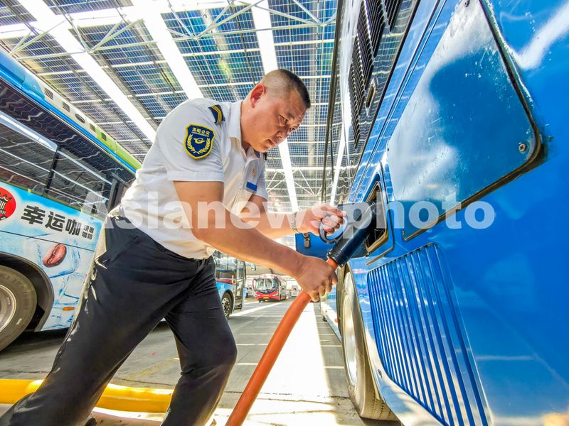 图片说明:2025年5月19日,河南省洛阳交投集团公交六分公司光伏发电项目正式投用,公交车长正在给公交车充电。