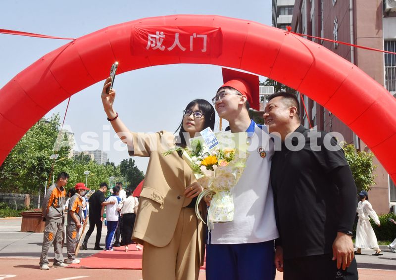 2025年5月18日,在河北省邯郸市永年区的衡一永华中学成人礼活动上,学生与家长拍照留念。