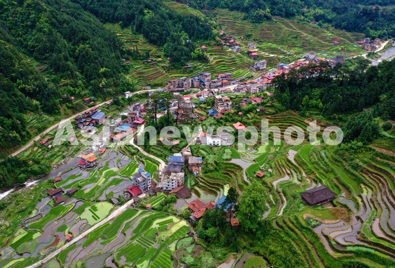 图片说明:2025年5月18日,在广西融水苗族自治县安太乡培秀苗寨,青山环抱着梯田,苗寨点缀其间,如诗如画,美不胜收。
