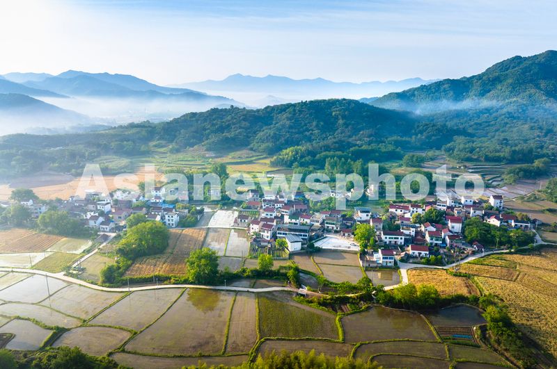 图片说明:2025年5月19日,安徽省芜湖市繁昌区孙村镇赤沙社区,错落有致的民居与青山、田野、道路、晨雾等相互映衬,构成一幅生态优美的田园画卷。