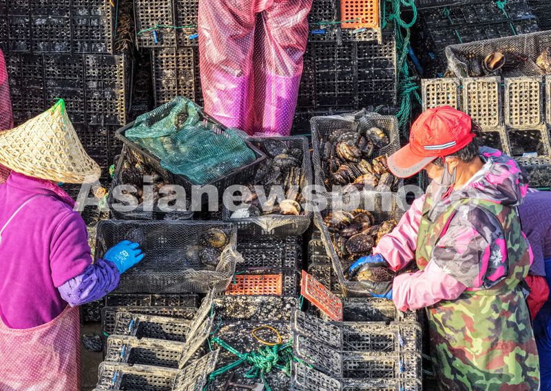 2025年5月20日,在山东省荣成市俚岛镇俚岛湾一处码头,养殖户卸运、分拣从福建归来的鲍鱼。