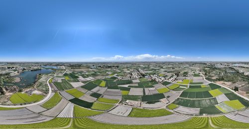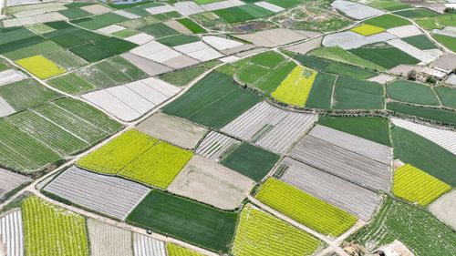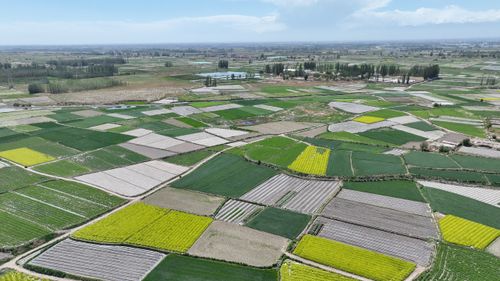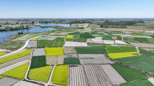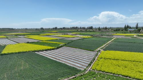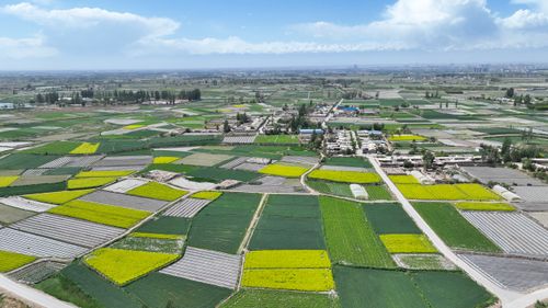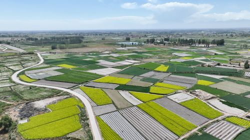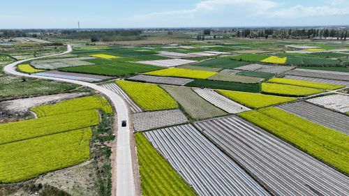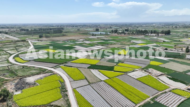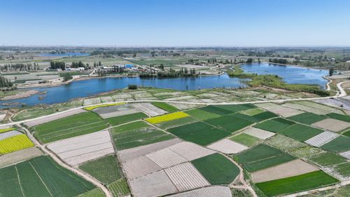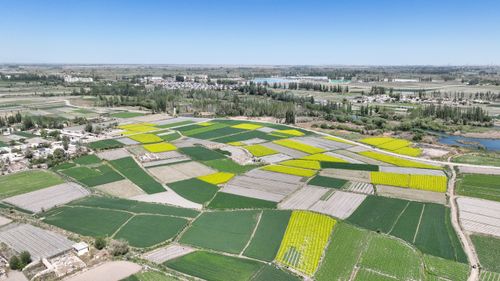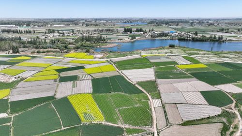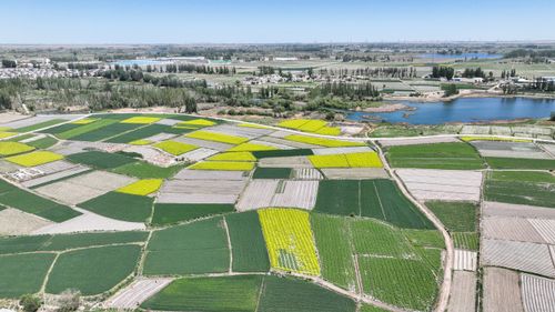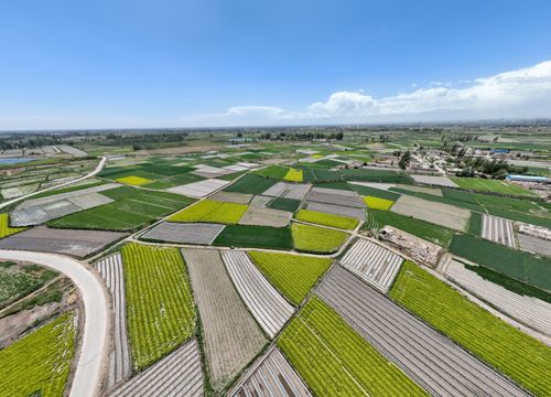 2025年5月24日,甘肃省酒泉市肃州区银达镇,多彩的田园、农房、道路和水库相映成景,宛如大地上的调色板,构成一幅美丽的初夏乡村田园画卷。