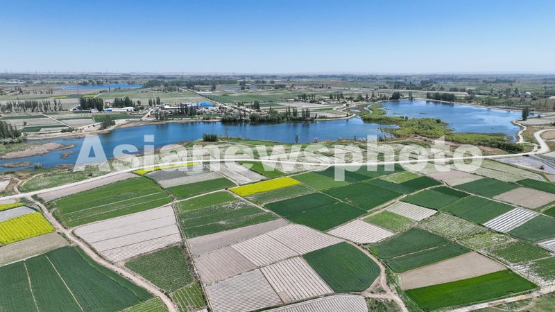 2025年5月24日,甘肃省酒泉市肃州区银达镇,多彩的田园、农房、道路和水库相映成景,宛如大地上的调色板,构成一幅美丽的初夏乡村田园画卷。