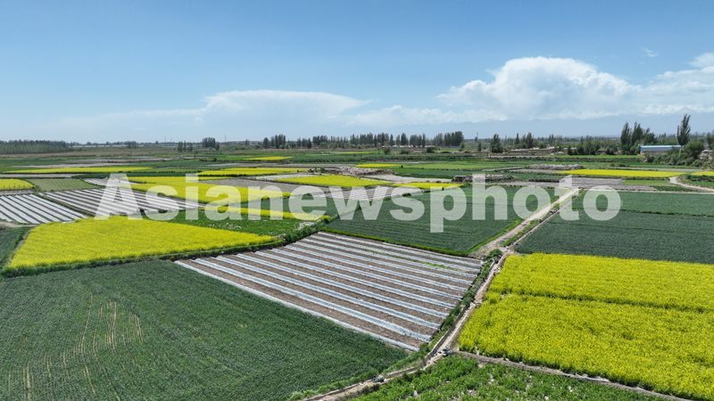 2025年5月24日,甘肃省酒泉市肃州区银达镇,多彩的田园、农房、道路和水库相映成景,宛如大地上的调色板,构成一幅美丽的初夏乡村田园画卷。