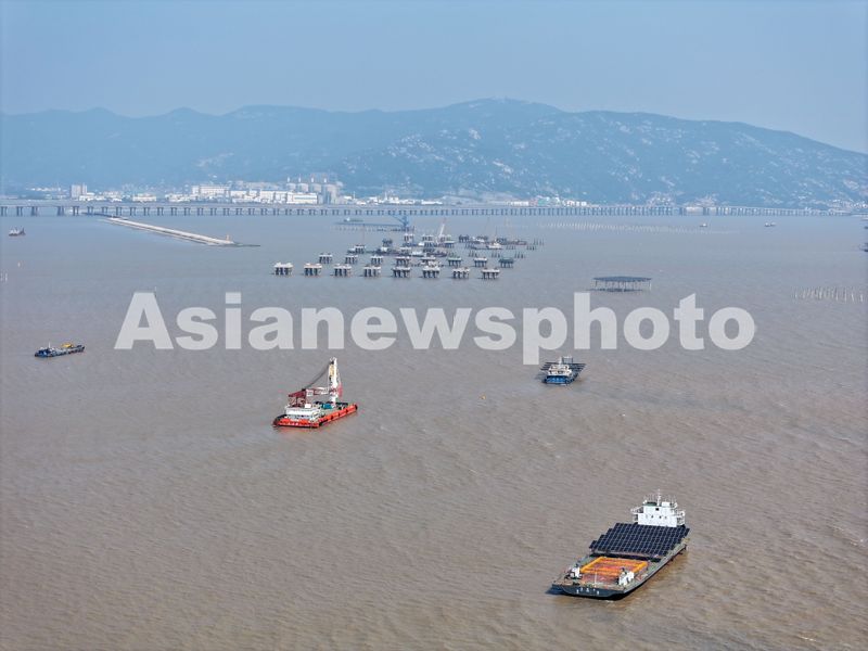 2025年5月24日,建设工人在中核田湾滩涂光伏示范项目施工现场进行海上作业。