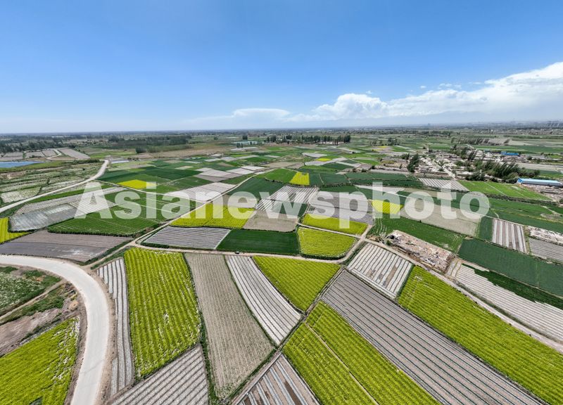 2025年5月24日,甘肃省酒泉市肃州区银达镇,多彩的田园、农房、道路和水库相映成景,宛如大地上的调色板,构成一幅美丽的初夏乡村田园画卷。