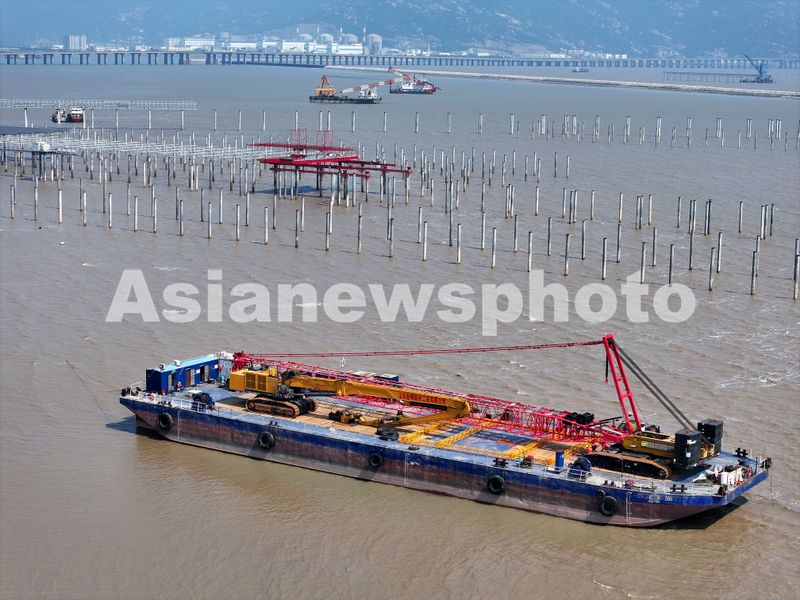 2025年5月24日,建设工人在中核田湾滩涂光伏示范项目施工现场进行海上作业。