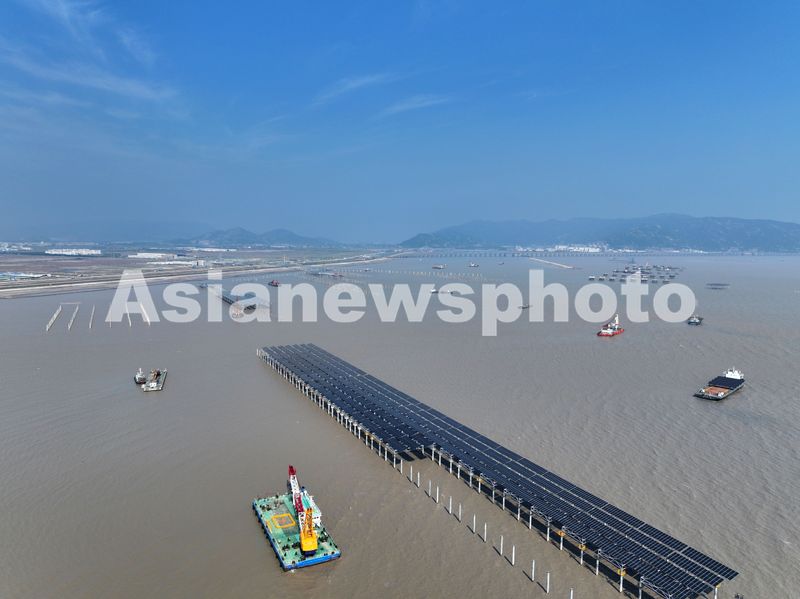 2025年5月24日,建设工人在中核田湾滩涂光伏示范项目施工现场进行海上作业。