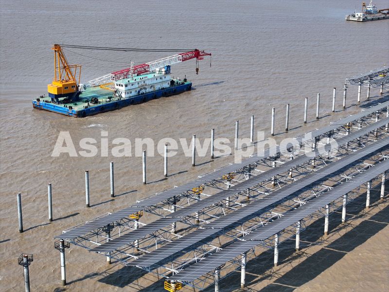 坐落在江苏省连云港市连云区境内的中核田湾滩涂光伏示范项目施工现场如火如荼,建设工人们抢时间、赶进度,加班加点在海上忙碌着打桩布板,处处一派繁忙景象。据了解,中核田湾滩涂光伏示范项目总投资达90亿元,水上施工部分划分为九个标段,涵盖光伏阵列、架空线路塔基、连陆廊桥以及一座220KV光伏升压站等关键建设内容,是我国最大的海上光伏项目。预计于年底实现全容量并网,在运行期25年内年平均上网电量22.34亿千瓦时。