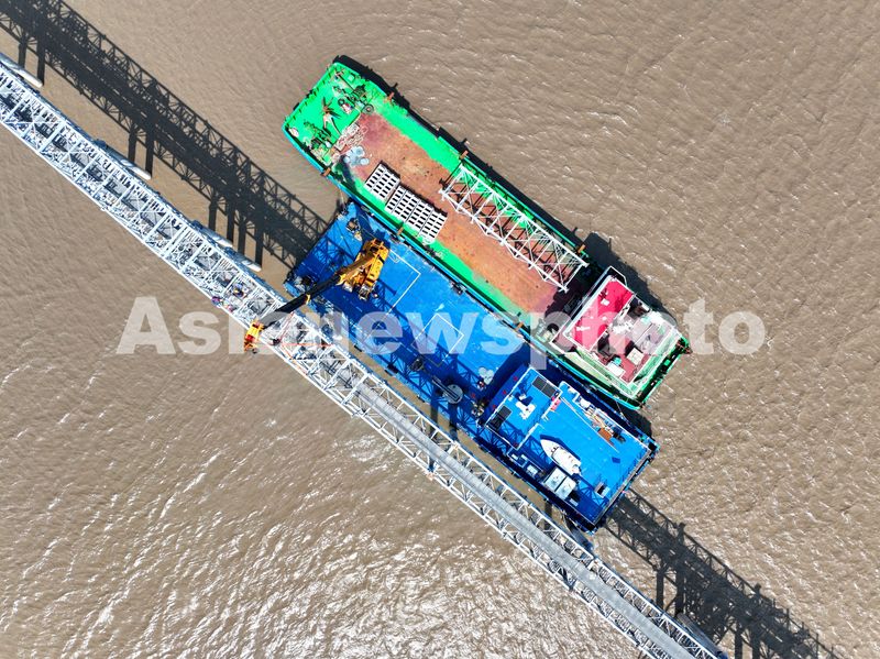 2025年5月24日,建设工人在中核田湾滩涂光伏示范项目施工现场进行海上作业。