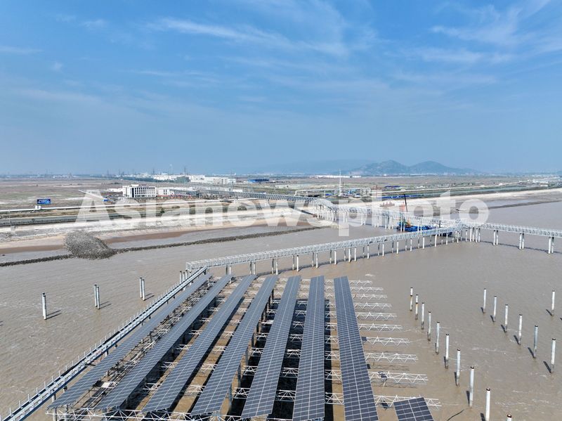 坐落在江苏省连云港市连云区境内的中核田湾滩涂光伏示范项目施工现场如火如荼,建设工人们抢时间、赶进度,加班加点在海上忙碌着打桩布板,处处一派繁忙景象。据了解,中核田湾滩涂光伏示范项目总投资达90亿元,水上施工部分划分为九个标段,涵盖光伏阵列、架空线路塔基、连陆廊桥以及一座220KV光伏升压站等关键建设内容,是我国最大的海上光伏项目。预计于年底实现全容量并网,在运行期25年内年平均上网电量22.34亿千瓦时。