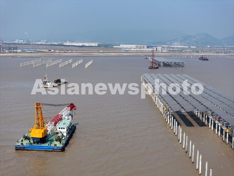 坐落在江苏省连云港市连云区境内的中核田湾滩涂光伏示范项目施工现场如火如荼,建设工人们抢时间、赶进度,加班加点在海上忙碌着打桩布板,处处一派繁忙景象。据了解,中核田湾滩涂光伏示范项目总投资达90亿元,水上施工部分划分为九个标段,涵盖光伏阵列、架空线路塔基、连陆廊桥以及一座220KV光伏升压站等关键建设内容,是我国最大的海上光伏项目。预计于年底实现全容量并网,在运行期25年内年平均上网电量22.34亿千瓦时。