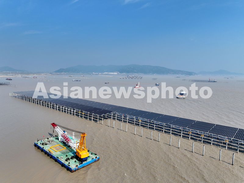 2025年5月24日,建设工人在中核田湾滩涂光伏示范项目施工现场进行海上作业。