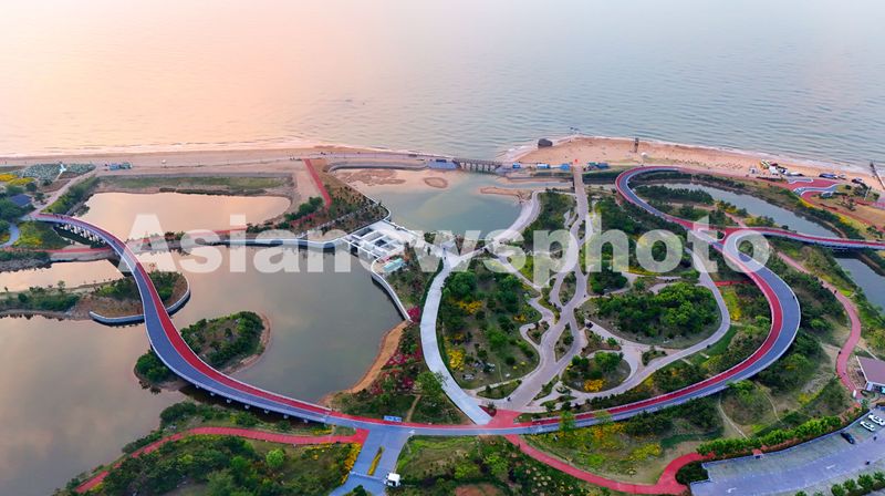2025年5月26日,晨光中的山东省日照市阳光海岸绿道景美如画。