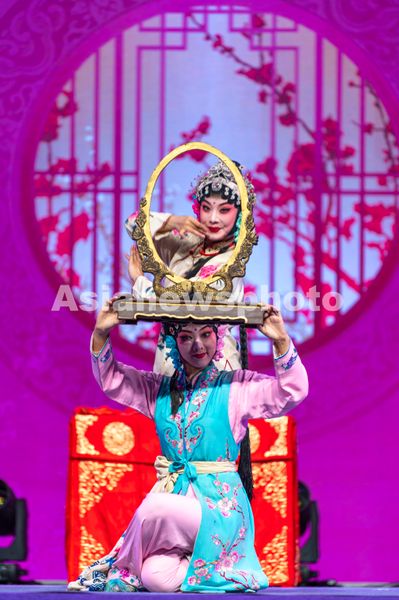 图片说明:2025年5月25日晚上,浙江省金华市丽泽中学校园里,婺剧演员在给全校师生表演传统婺剧选段。