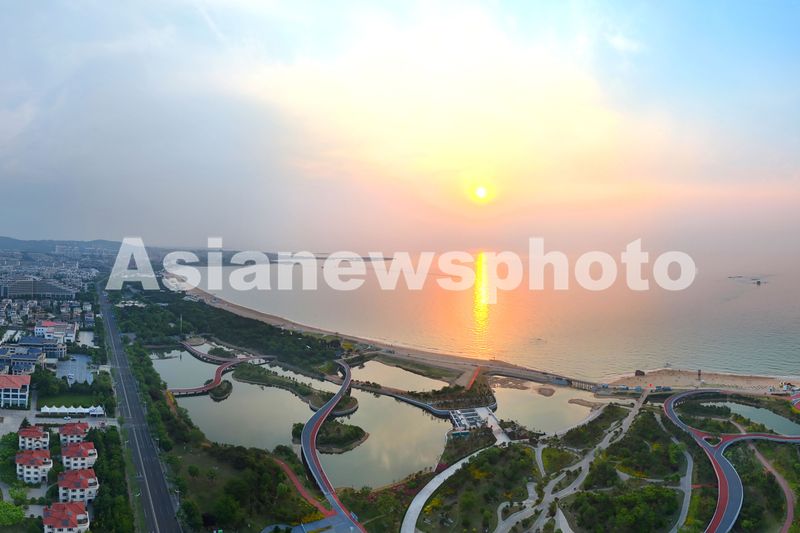 2025年5月26日,晨光中的山东省日照市阳光海岸绿道景美如画。