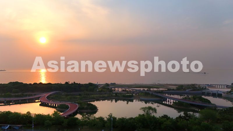 2025年5月26日,晨光中的山东省日照市阳光海岸绿道景美如画。