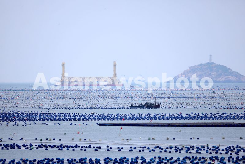 2025年5月27日,福建省福州市连江县定海湾海域的海洋牧场,养殖工人驾驶养殖船来往穿梭,一派繁忙景象。