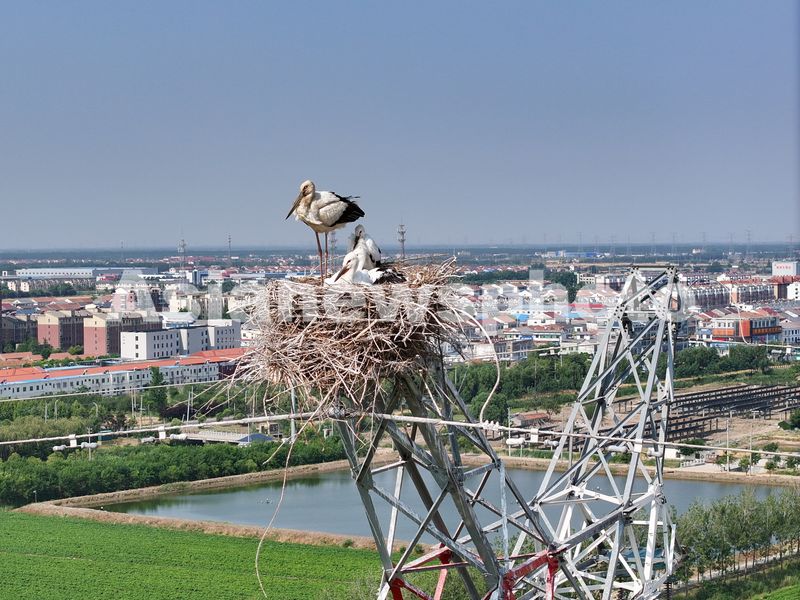 初夏时节,江苏省连云港市赣榆区墩尚镇一处高压铁塔上,新出生的东方白鹳幼鸟羽翼渐丰,它们在东方白鹳成鸟的看护下茁壮成长。