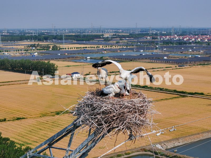 初夏时节,江苏省连云港市赣榆区墩尚镇一处高压铁塔上,新出生的东方白鹳幼鸟羽翼渐丰,它们在东方白鹳成鸟的看护下茁壮成长。