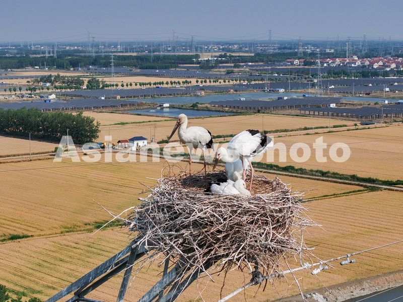 初夏时节,江苏省连云港市赣榆区墩尚镇一处高压铁塔上,新出生的东方白鹳幼鸟羽翼渐丰,它们在东方白鹳成鸟的看护下茁壮成长。
