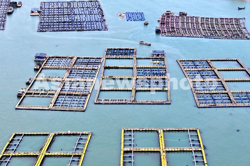2025年5月27日,福建省福州市连江县定海湾海域的海洋牧场,养殖工人驾驶养殖船来往穿梭,一派繁忙景象。