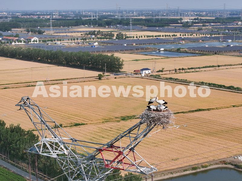 初夏时节,江苏省连云港市赣榆区墩尚镇一处高压铁塔上,新出生的东方白鹳幼鸟羽翼渐丰,它们在东方白鹳成鸟的看护下茁壮成长。