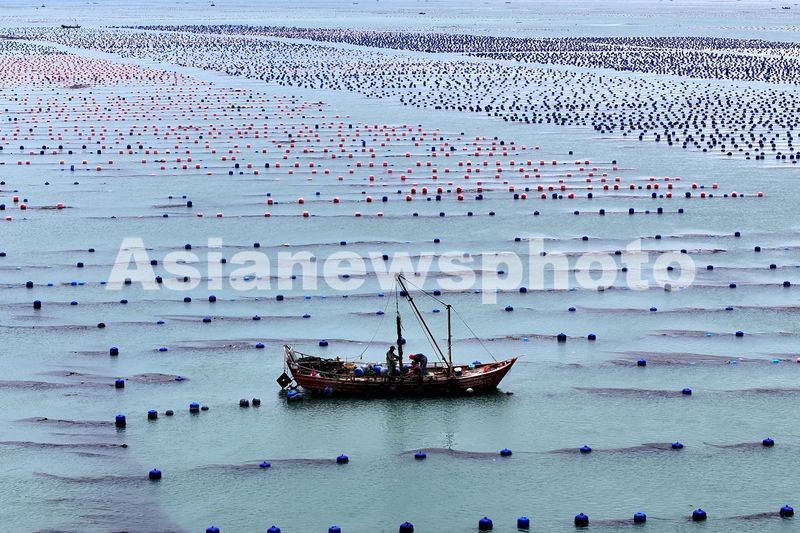 2025年5月27日,福建省福州市连江县定海湾海域的海洋牧场,养殖工人驾驶养殖船来往穿梭,从事海带收获、鲍鱼转场等各类海上养殖作业,一派繁忙景象。