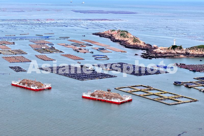 2025年5月27日,福建省福州市连江县定海湾海域的海洋牧场,养殖工人驾驶养殖船来往穿梭,一派繁忙景象。