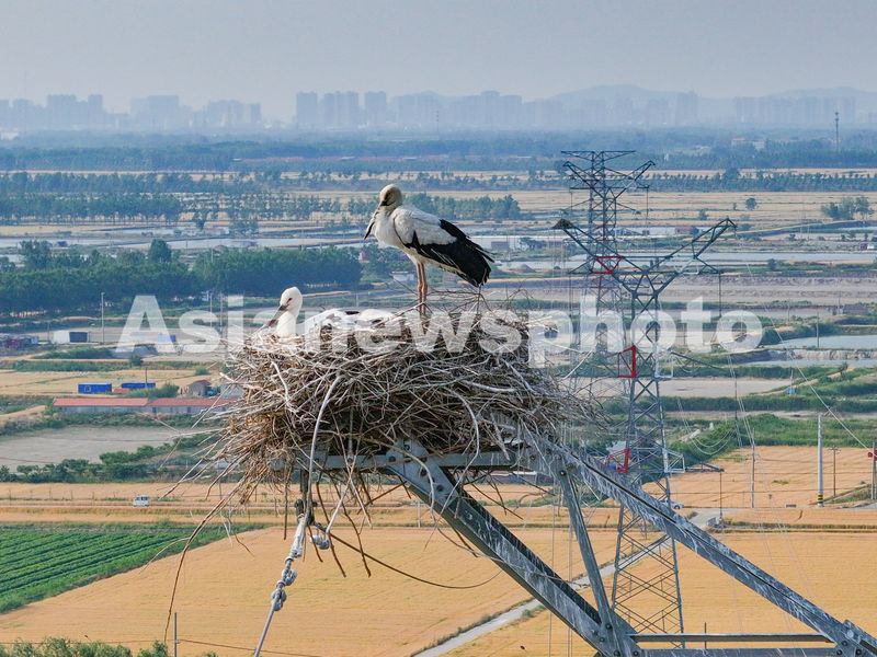 初夏时节,江苏省连云港市赣榆区墩尚镇一处高压铁塔上,新出生的东方白鹳幼鸟羽翼渐丰,它们在东方白鹳成鸟的看护下茁壮成长。