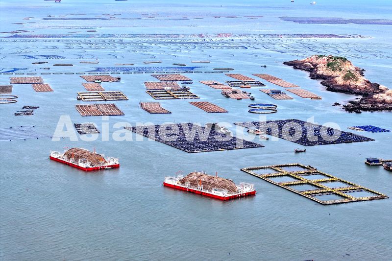 2025年5月27日,福建省福州市连江县定海湾海域的海洋牧场,养殖工人驾驶养殖船来往穿梭,一派繁忙景象。
