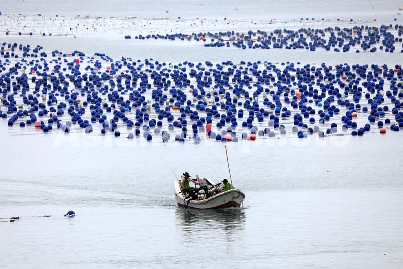 2025年5月27日,福建省福州市连江县定海湾海域的海洋牧场,养殖工人驾驶养殖船来往穿梭,一派繁忙景象。