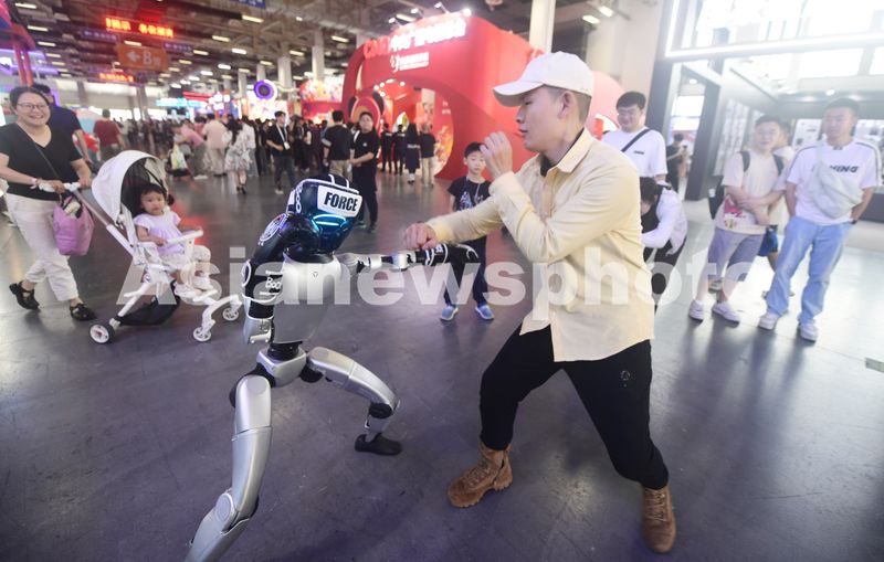 2025年5月29日,参观者在第二十一届中国国际动漫节上与刚参加过“CMG世界机器人大赛·系列赛”机甲格斗擂台赛的宇树G1人形机器人进行“拳击比赛”。