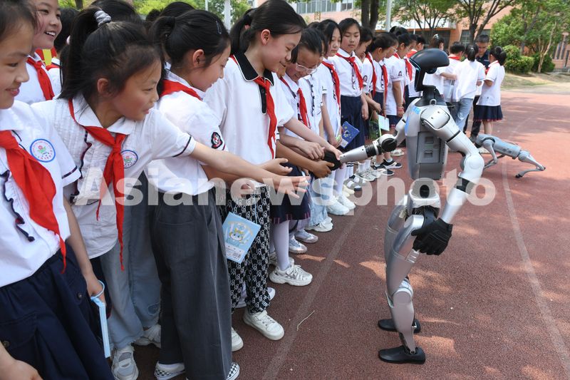 图片说明:2025年5月28日,安徽省阜阳市实验小学北京路校区四年级(5)班的小学生在校园操场上与人形机器人和机器狗互动,领略人工智能的魅力。