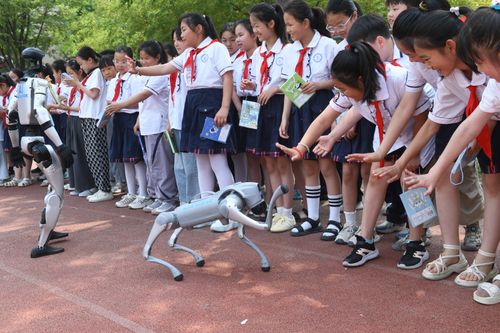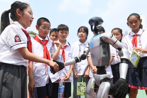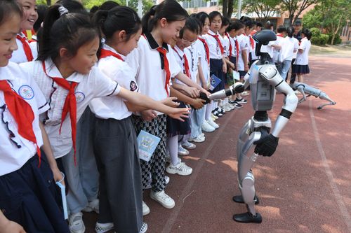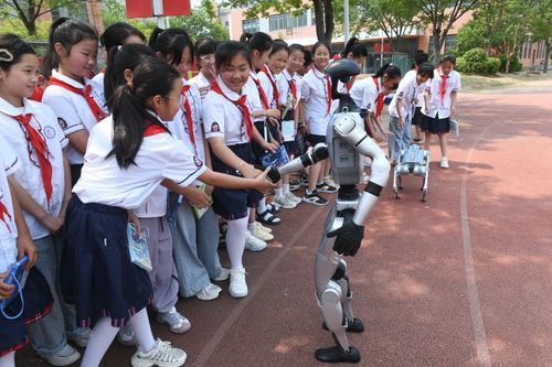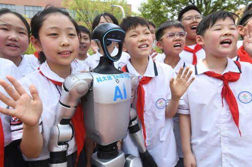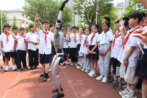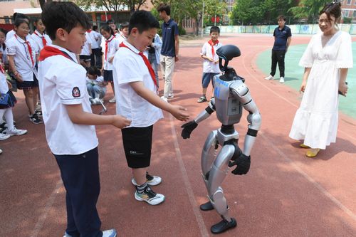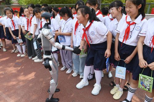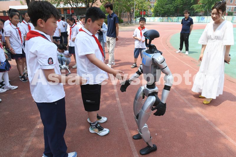 图片说明:2025年5月28日,安徽省阜阳市实验小学北京路校区四年级(5)班的小学生在校园操场上与人形机器人互动,领略人工智能的魅力。