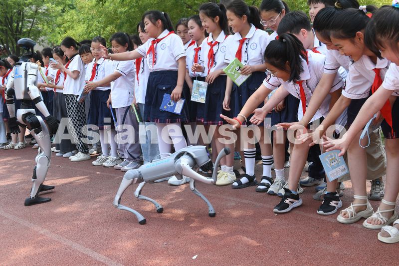 图片说明:2025年5月28日,安徽省阜阳市实验小学北京路校区四年级(5)班的小学生在校园操场上与机器狗和人形机器人互动,领略人工智能的魅力。