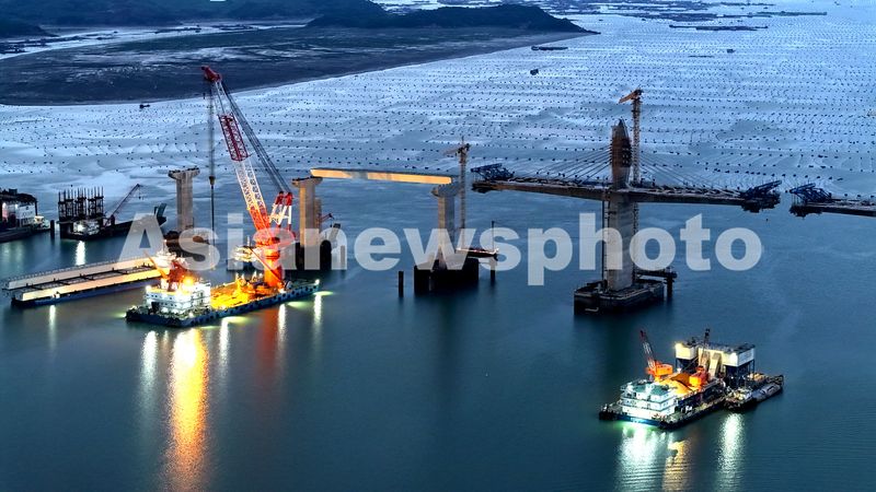 图片说明:2025年5月29日,工人在福建宁德霞浦县溪南镇的宁上高速公路东吾洋特大桥工程项目现场加紧施工。