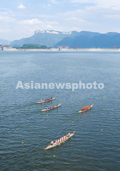 5月30日,参赛队伍在三峡坝前湖北省宜昌市秭归县徐家冲港湾水域参加龙舟竞渡。