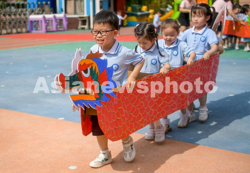 2025年5月30日,在河南省洛阳市洛龙区第五实验幼儿园内,小朋友正在进行旱地龙舟比赛。