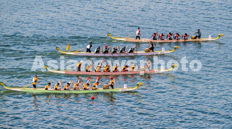 5月30日,参赛队伍在三峡坝前湖北省宜昌市秭归县徐家冲港湾水域参加龙舟竞渡。