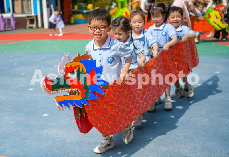 2025年5月30日,在河南省洛阳市洛龙区第五实验幼儿园内,小朋友正在进行旱地龙舟比赛。
