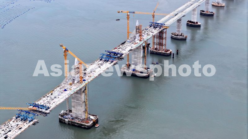 图片说明:2025年5月29日,工人在福建宁德霞浦县溪南镇的宁上高速公路东吾洋特大桥工程项目现场加紧施工。