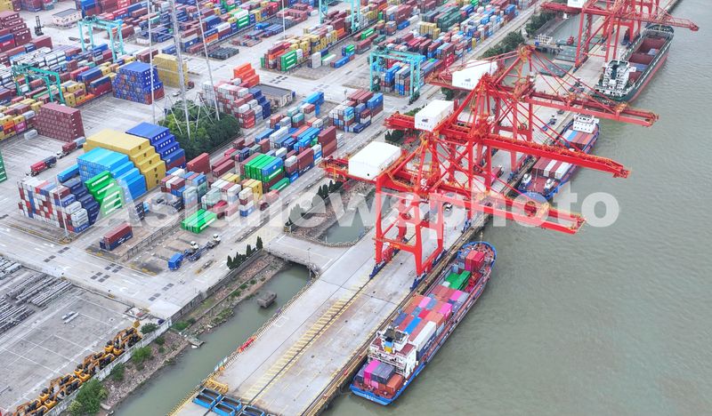 图片说明:2025年5月31日,江苏张家港港码头车来船往,货物装卸繁忙有序。
