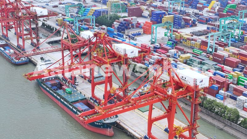 图片说明:2025年5月31日,江苏张家港港码头车来船往,货物装卸繁忙有序。