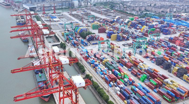 图片说明:2025年5月31日,江苏张家港港码头车来船往,货物装卸繁忙有序。